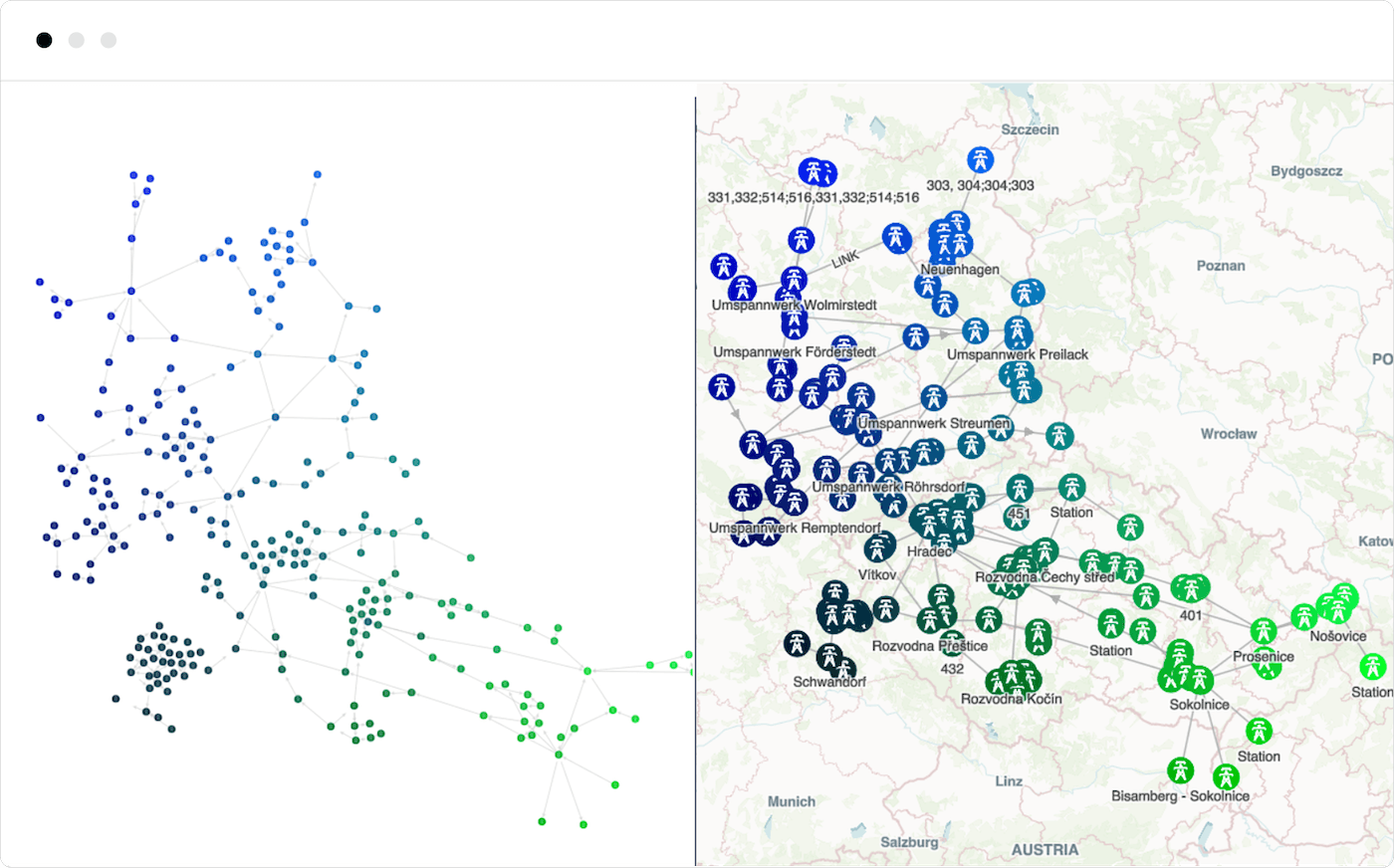 We’ve introduced a geo-influenced graph layout that incorporates nodes’ geospatial locations into their force-directed positioning. This keeps graph and map views aligned, making it easier to connect network structure with real-world geography.