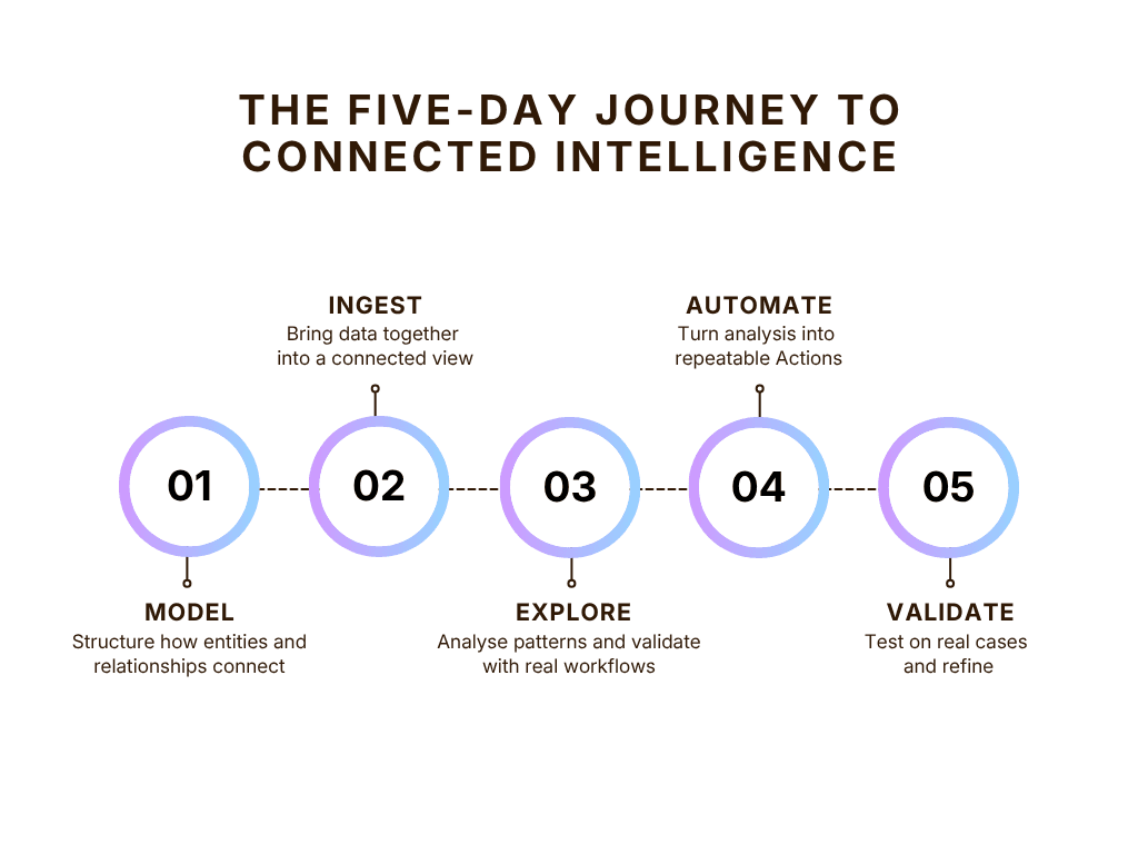 This blog post outlines a five-day process I’ve used with teams to move from fragmented data to a working, connected intelligence environment. The same pattern applies anywhere teams need to connect data, explore relationships, and answer complex questions under pressure.