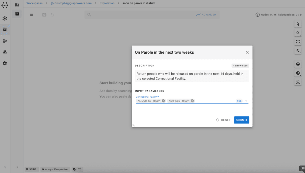 Analysts begin exploring the graph in the same way they would approach a real case, starting from a hypothesis, searching for known entities, and expanding outward.