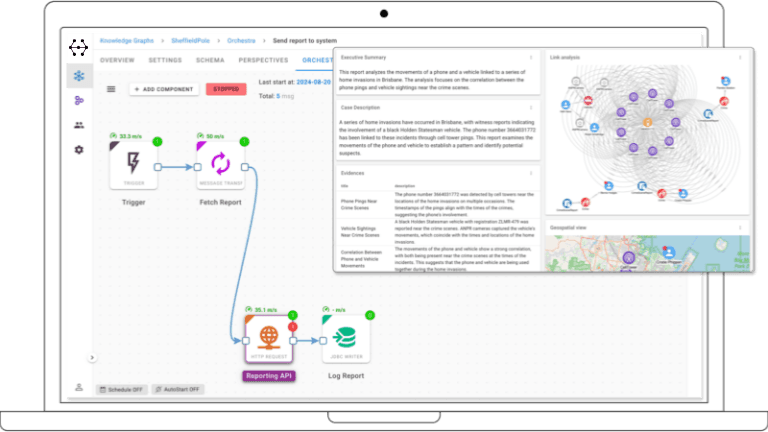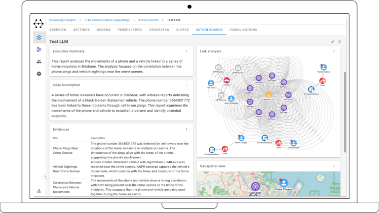 Generate intelligence reports using Action Boards, combining multiple visual formats, such as text, graph visualisations, and maps, within a single view.